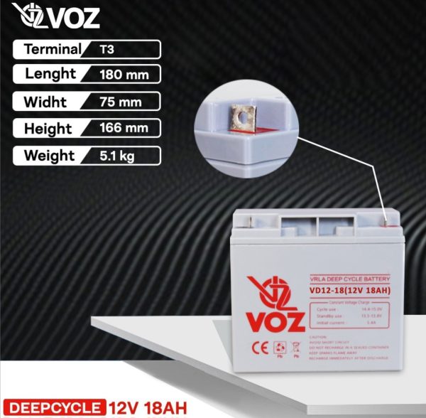 Baterai VRLA VOZ VA 12-18 menggunakan teknologi Valve Regulated, Absorbent Glass Mat. Jenis baterai Absorbent Glass Mat (AGM) memiliki beberapa keunggulan dibandingkan baterai flooded lead acid (baterai basah), termasuk anti tumpah dalam posisi penempatan apapun, performa lebih baik pada penggunaan daya listrik besar, dan performa lebih baik untuk penggunaan sebagai daya listrik cadangan.